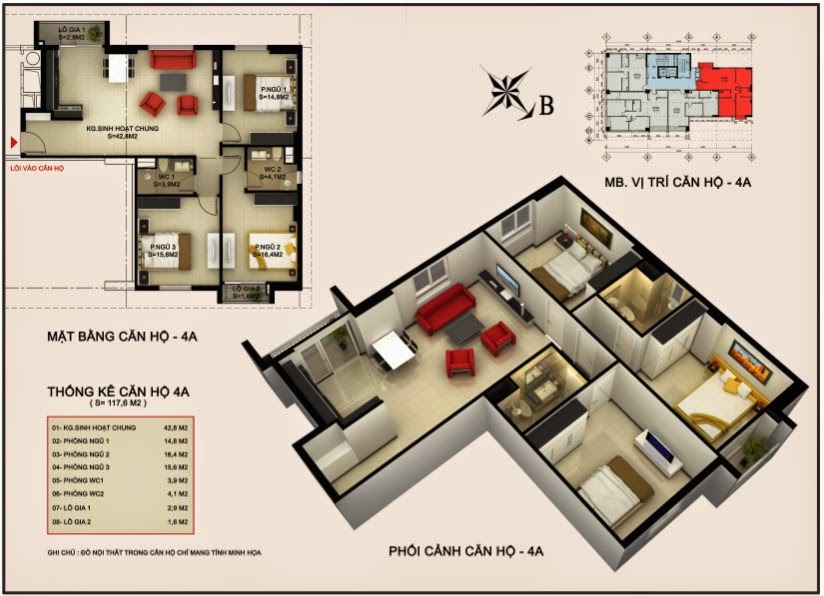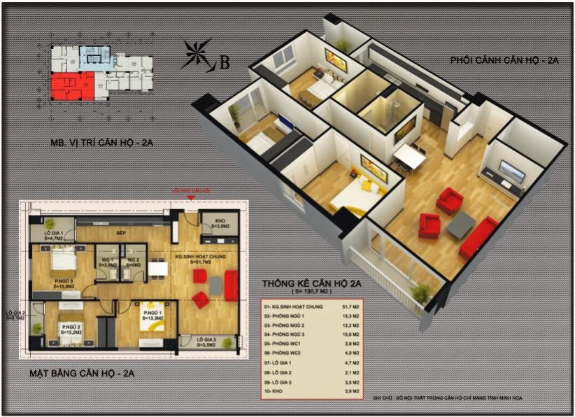 - Căn hộ 3 PN, 2 WC: 117,6 – 130,7 m2